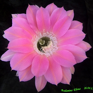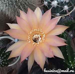 Родители: Ech. hybr x Echinopsis Terpsichore. Детки с сеянца, выращенного мною. Материнское растение шаровидной формы с выраженными длинными колючками, тёмно-зеленого цвета. Зацветает в середине лета прекрасными цветами. Лепестки по краям бледно-розового цвета, в середине яркая розово-оранжевая стрелка. Внешний круг длинные, закручивающиеся лепестки пастельного цвета. Аромат средней силы, приятный. Продаётся не укоренённая детка с зачаточными корнями