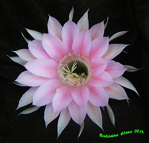 Эхинопсис шаровидной формы. 3 круга лепестков. Большой цветок 11 см в диаметре. Цветочная трубка 18 см. Овальные лепестки белого цвета, внешний ряд розового цвета. На кончиках лепестков выемки. Слабый, цветочный аромат болотных растений. Продаются детки с корнями 2,5 х 2,5 см - 450 р