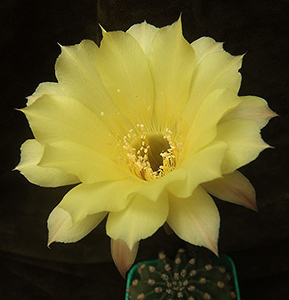Кактус плоско-шаровидной формы. Хорошо деткуется. Колючки маленькие, почти незаметные. Зацветает жёлтым цветком 9,5 см диаметром. Цветочная трубка 14 см. Тонкий, приятный, цветочный аромат.