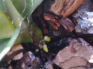 Покажу результаты своей реанимации с применением корневина в порошке. Фал осенью был залит, корневая умерла, после весь декабрь мы упорно теряли тургор, когда листья стали угрожающе вялыми были определены в 5ти л банку под лампу, но корни упорно не хотели растить. Мне надоело и я с отчаяния оторвала два нижних листа, засунула мокрую ножку с 9-тью зачатками корней в порошок-корневин. И облепленную ножку так и посадила в мелкую кору назад в банку. Далее только опрыскивания по листу. На фотографиях результат после 3-х недель после обработки корневином. Как только родился первый корень, фал из банки был помещен назад в комнатную 50% влажность, опрыскивается утром и вечером, растит лист, два корня с одной стороны, два корня с другой и 5ый корешок тоже проклевывается. Кормлю его усиленно и по листу, и уже по корням, замачиваю на 40 - 60 минут. В коре все просыхает за часы.