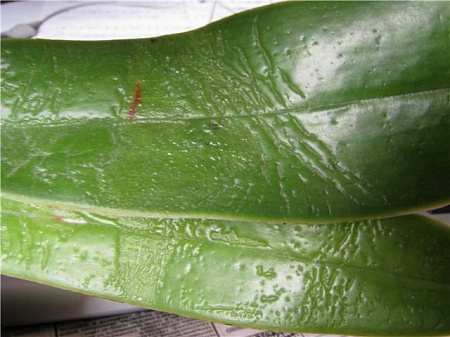 А вот теперь уже и я не уверенна, что это клещ. Мое предположение было основано на том башмаке, который мне отдали с такими следами, и пояснили, что это происки клеща, но растение давно обработано, а следы остались. Сейчас осмотрела все свои башмаки (их правда всего 6). Так вот таких пятен нет только на одном, а на остальных, в большей или меньшей степени они есть, а на одном даже молодой листик вылезает уже с такими.