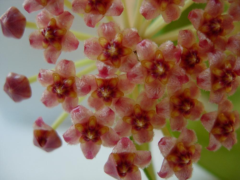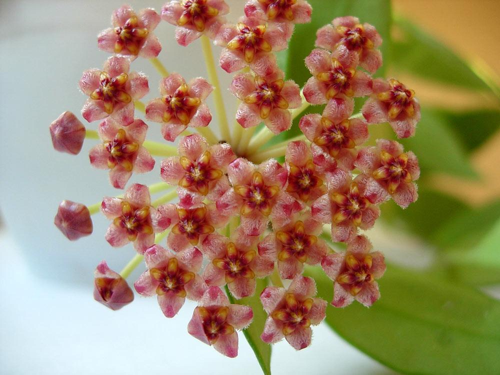 Только что отцвела грацилис. Это единственная хойка, которая цвела у меня в эту жару. Цветы держались не долго - несколько дней, запах слабый, ощущается только когда сунешь нос в корзинку . Цветоносы располагались и наверху, у основания хойки, и посередине, и в самом низу, на лысой плети. Фотки без вспышки, так лучше виден натуральный цвет цветочков: