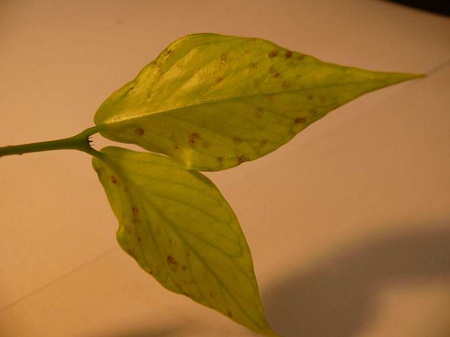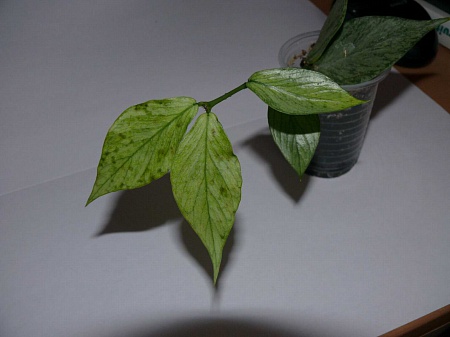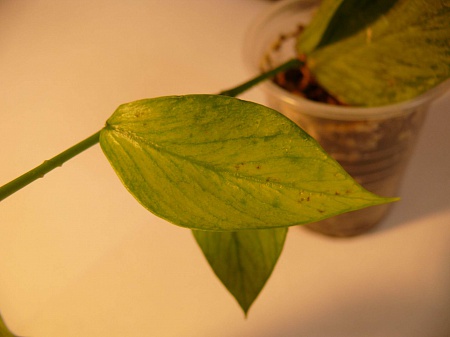 Купила укоренённый черенок хойи Polyneura. Появился новый рост. Недавно на 3-х новых листиках из 4-х появились коричневые пятна. На нижнем листочке, который появился первым, пятен нет, как и на листиках черенка. Помогите, пожалуйста, советом. Что это может быть?