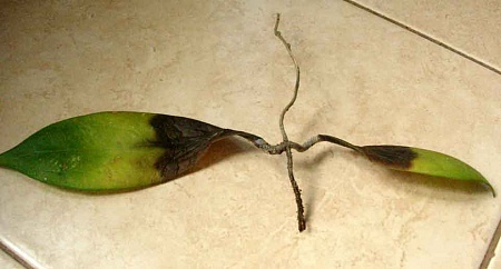 suvi, Возможно, черенок так прореагировал на резкую смену условий,т.е. получил стресс.Каждое растение носит в себе какие-либо вирусы и бактерии,но они не проявляют себя при привычных растению условиях,а при резких колебаниях температурного режима,состава воды,почвы и т.д. дают о себе знать.Люди,между прочим, тоже попадая из зимы в лето(то бишь среди зимы из Москвы в Египет,например)не всегда легко переносят смену климата и другую воду и пищу.И чего только тут не проявляется...Ваш черенок,видимо испытал подобные проблемы,а поскольку это даже не растение,а пара листьев,то проявления стресса оказались губительными.