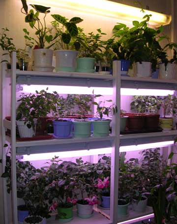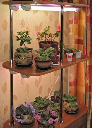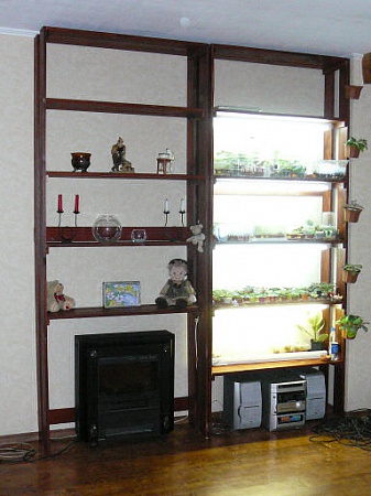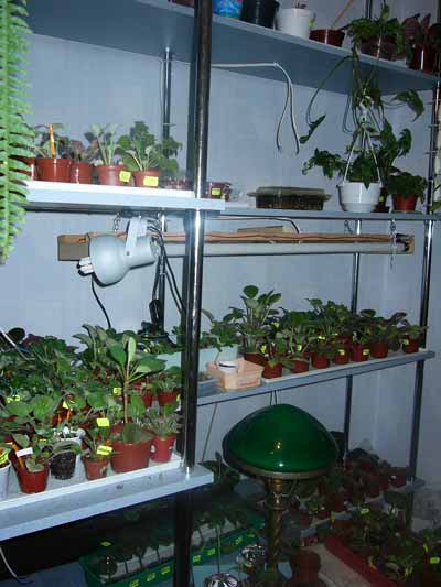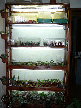 У меня два икеевских стеллажа, соединенные в один. Куплены были исключительно для обеспечения нормальной зимовки (из-за недостатка естественного освещения), а не ради эстетичности. Только вот фотка темноватая получилась.