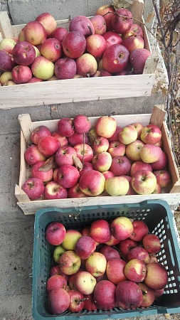 Яблочки не крупные, к осени становятся тёмно-красные, созревают примерно в октябре, мякоть очень плотная, белая или зеленоватая, лежат отлично (до весны), сочные, есть маленький привкус крахмала