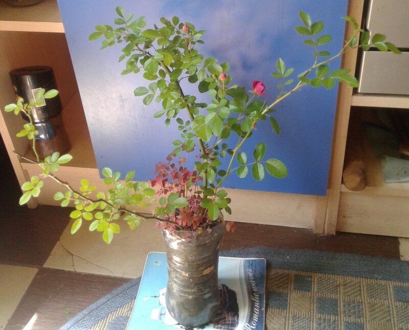 Барбарис с бордовыми листьями. Сорт утерян. Красивое яркое пятно в саду. Укорененный прошлой осенью черенок, зимовал без утепления в земле. Малыш, но уже цветет. Нашел новый дом.