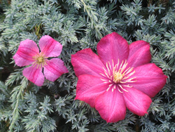 Мне бы хотелось на одну опору по 2 клематиса посадить-навстечу друг другу. что бы они были насыщеной окраски и сходились немного в контрастной расцветке, а так же конечно по размерам. Не так что бы один был до 2 метров а второй до 4-х.