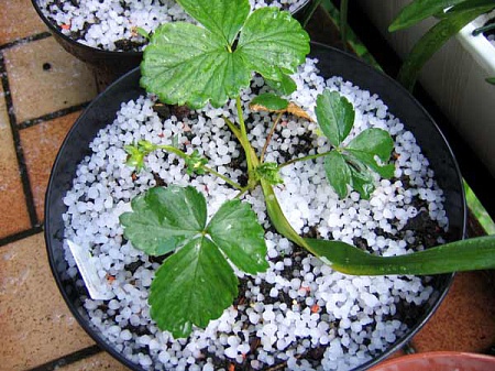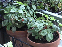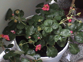 У меня земляника в горшках уже год растет и в этом году уже ягоды были, правдо немного кисловатые Я навоза немного в землю подмешала.