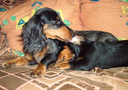 и хотя все они уже в месяц были расписаны, я думала, не дотяну до того дня, когда детки переедут на новое место жительства, чессслово! Одно кормление чего стоило, мама дорогая! Мамашка, ободранная, высосанная досуха и замученная, просто уже бегала от этой кошмарной своры, я только-только успевала покормить последнего, когда первый снова начинал орать, в общем, понимаете. Но вообще соц опрос по поводу таксят провести мона - у нас многие уже спрашивали, кто его видел, не ожидается ли в перспективе наследников.