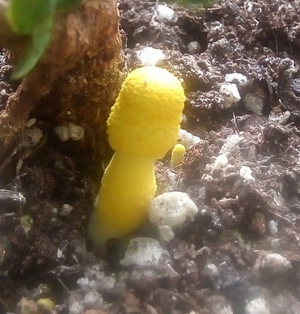 Время от времени в горшках с домашними растениями можно встретить необычные желтые грибы, которые сразу же привлекают внимание. Плодовые тела Белонавозника Бирнбаума вызывают не только любопытство, но и переживание за сохранность наших зеленых питомцев. Должен сказать, что гриб этот является сапротрофом, т.е. питается корой, мхом и прочими растительными остатками в субстрате, и не паразитирует на растениях, однако по некоторым данным он способен составлять значительную конкуренцию растению, поглощая питательные вещества и влагу, необходимые для жизнедеятельности растения. Если вы решите избавиться от "незванного гостя", придется поменять весь субстрат в горшке и как следует промыть корни растения. Этот гриб распространен в Северной Америке и Европе, однако за счет своей неприхотливости и способности обитать в цветочных горшках, может быть встречен во многих уголках планеты.