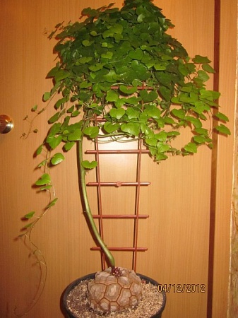 я ее купил лет 6 назад годовалым сеянцем 1.5см, в период роста с сентября по апрель поливаю обильно, стоит на балконе температура зимой опускается до +5, средняя в период роста +10+20гр, хорошо растет на торфосмесях, из семян поднимаются быстро, за первый год до двух сантиметров, на второй год начинают трескаться, на третий год некоторые достигают 5-6см диаметра, каудекс желательно предохранять от перегрева и прямого солнца особенно летом, когда в мае листья начинают желтеть отрезаю лиану и убираю горшок в тень, поливаю изредка пока не проснется