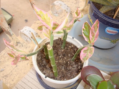 Ой, и тут тоже интересненько... Нарвала черенков педилантуса вариегатного, воткнула в грунт, поставила на восточное солнышко и забыла на пару месяцев... Появилась уже поросль, постараюсь на днях сфотографировать. Уже Вот мой малыш... Растет!!!