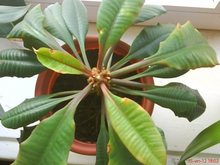 С верхними листочками какая-то беда. Подскажите,что происходит с цветком? Как ему помочь? Нижние листочки вроде в норме, только с верхними такая беда...