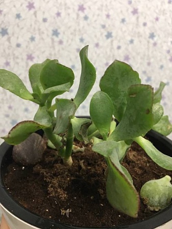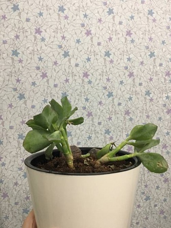 Все было хорошо, но потом оно стало плохо выглядеть (отваливались листья, на листьях появлялось что-то вроде язвочек) и с каждым днем все хуже. Потом я узнала, что его поливали без меня, а их вроде как нельзя часто поливать. Возможно это причина. Поливать перестали, а лучше не становится. Посоветовали пересадить. Купила землю для кактусов и суккулентов - пересадила. Во время пересадки, решила отрезать один стебелек и оставить его здоровую часть, так как он уже просто лежал и был очень мягкий. Отрезала по потемневшему сгибу.