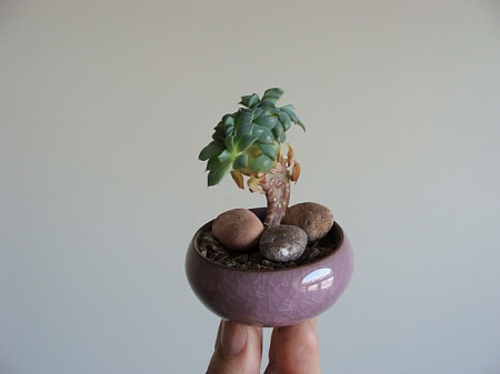 Прошу оценить идею и ее реализацию. Начал создавать миниатюрные бонсай из суккулентов. Главное отличие от "Сада в плошке" - то, что я стремлюсь использовать именно одиночные растения. И создавать композицию растение+горшок+камни.