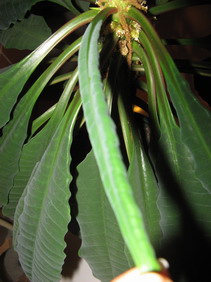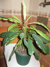 вот такая загадка случилась с моим молочаем - рос себе, рос, цвел и хорошел, никогда ничем не болел - и вдруг я замечаю очень странные молодые листья на верхушке: узкие, короткие, один даже какой-то подскрученный (последнее фото в этом посте). кончики у листьев острые - тогда как у всех остальных они округлые. прикладываю общее фото цветка и крупным планом старые, нормальнеы листья, чтобы было понятно, как они отличаются от новых, "проблемных".