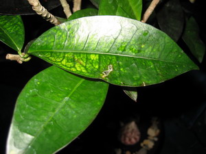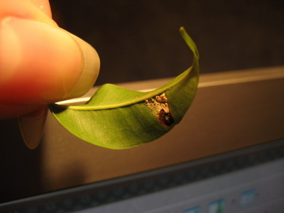 Ой, мамочки... наверное это не ожег Осмотрела листики фикуса и ужаснулась... обнаружила вот что (см. фото). Что это? И как бороться???