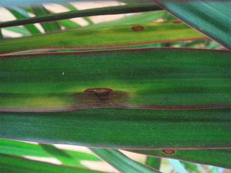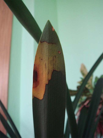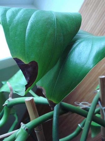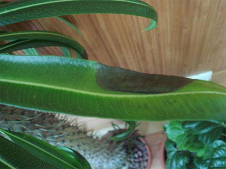 На некоторых растения сбоку листа появляются темные пятна, причем появляются они как-то точечно, а затем эти точки увеличиваются в размерах, лист желтеет и опадает.