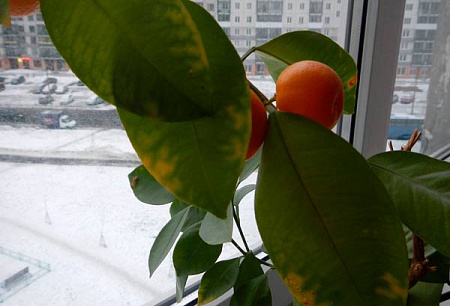Мандарин уходит под зиму с плодами, что истощает растение, сейчас следует оборвать плоды, дать отдохнуть ему, под кашпо подложить кусок пенопласта, толщиной 2см., поливать реже, не заливая, давать подсыхать грунту, что бы к корням проходил воздух, учитывая, что от радиатора отопления поднимается сухой и жаркий воздух, чаще опрыскивать растение, если эстетика не очень важна, то, сверху, на радиаторе, можно закрепить лоток, куда время от времени подливать воду, так воздух будет менее сухим, это сейчас, а вообще необходимо подкармливать растение различными удобрениями, в периоды бутонизации и созревания плодов, именно для этих моментов существуют свои подкормки, а в остальное время для подкормки и наращивания листьев. Если хотите изменить условия содержания, то уберите с подоконника, обеспечьте хорошей подсветкой + подкормка с учётом плодоношения + опрыскивание. Еще, не помешало бы, на данном этапе, опрыскать растение Эпином-Экстра, а почву, пролить раствором Фитоспорина -М, попробуйте поискать информацию, в интернете, про содержание данного вида в квартире.