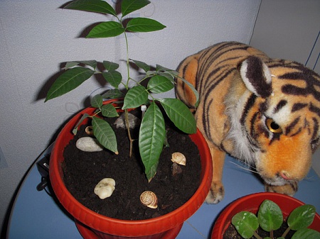 Olore, у меня два растения из косточек. Плоды привезла из Тайланда. Одно растение стояло на подоконнике, второе на столе.У первого листья стали бурыми, второе - зелененькое. Сейчас оба стоят в тени. Кстати, еще одно растение растет из семян, которые насобирала тоже в Тайланде. Стояло на окне и после выходных листья стали бурыми и отвалились. Сейчас переставила и пошли новые зеленые листочки. Правда моим растениям только 1,5 года. Но я надеюсь на лучшее!