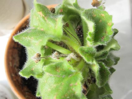 3 фиалки росли у меня давно, 3 благополучно укоренились из листиков и собирались цвести (новые около 4 мес. назад пересадила в новую землю). В комнате меняли окно и на 3 дня фиалки переехали на кухню, чуть ранее появились комарики и я вставила в горшки по 4 спички. Вернула цветы на старое место с новыми окнами, через 5 дней пребывания там вот что с розетками (все фиалки собирались цвести, бутоны засохли)