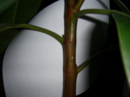 За 2 года вырос с 30 см до 1,4 м. На стволе появилось несколько почек,но фикус продолжал расти вверх. И я весной прошлого года решилась и обрезала ствол на один лист выше двух этих спящих почек. В итоге сначала начали расти эти почки, а потом и из верхнего листика пошел отросток. В итоге 3 веточки, правда цветок великоват получился. Еще читала, что если верхнюю ветку с точкой роста отогнуть вниз, это будет стимулировать рост боковых. Вот фото почки, извините за качество, макросъемку делать не умею, в фотошопе не сильна