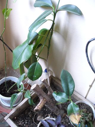 У меня тоже было 2 длинных голых палки с тремя листиками с верху под названием фикус. Я их разрезала пополам, года полтора назад, вот что получилось. Сверху - нижняя часть одного из них, снизу два красавца, которые выросли из верхушек. Чтоб заставить ветвиться, надо верхушку обрезать, мне пока жалко, пусть подрастет еще чуть-чуть. [IMG][/IMG] [IMG][/IMG]