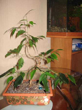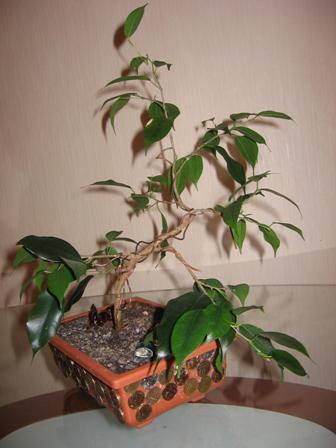 вот мой бонсай из фикуса. начала делать прошлой весной. была совсем тоненькая ветка, отрезанная с большого фикуса. меньше чем за год уже все гости узнают что это бонсай))