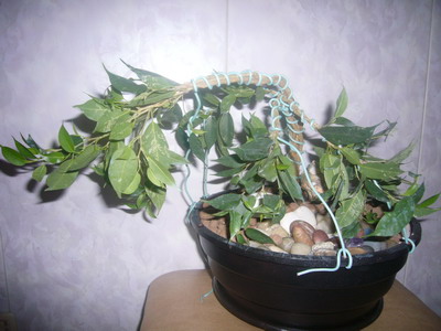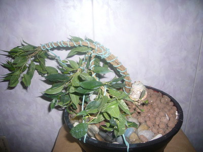 Здравствуйте уважаемые цветоводы! Я к вам за советом . Один знающий человек предложил мне поэкспериментировать и сотворить из моего фикуса бонсай. Долго рассказывал про разные стили, в итоге сошлись вот на такой форме. Не в обиду знатоку, но я не до конца уверена что этого мученика в корсете можно можно к этому самому бонсай отнести, поэтому не посылайте меня, пожалуйста, к "бонсаистам", боюсь не вынесу позора . У меня несколько вопросов, потому как хочу знать еще чье-то мнение кроме вышеупомянутого "доброжелателя": 1. не вреден ли растению такой изуверский перегиб; 2. после снятия проволоки не расплетутся ли и не разогнуться сформированные ветки ; 3. не велик ли горшок и что делать с корнями (корней много, куст был мощный, как и корневая система, корни я не обрезала, а сейчас осталось "три пера", может нужно часть убрать?); 4. на стволе постоянно появляются новые почки, прямо чуть ли не каждый день, их постоянно так и придется обрывать, или со временем это прекратиться; 5. как вам вообще это чудо? Обещали, что будет красиво, вот только когда... Как думаете, будет ли вообще? Только не кидайте в меня тапками, поддалась на провокацию, теперь вот морально страдаю. Началось все весной, тогда все было обрезано, сплетено и загнуто первично, 2 недели назад доработано и перемотано проволокой заново, увеличили загибы. В принципе читала литературу, из которой сделала вывод, что бонсай это нечто другое, поэтому давайте его не будем рассматривать в этом ключе, а просто как вариант формирования кроны. Фото прилагаю, с нескольких ракурсов, чтобы понятнее было.