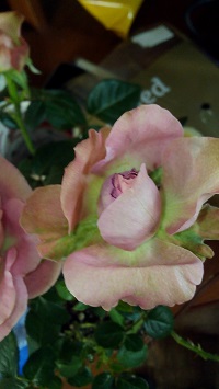 Купила сегодня еще одну красотку. Очень интересный цвет- розовый как будто припорошенный. Может кто знает как ее зовут. Горшок-12. Состояние не очень, но удержаться не было сил. Запах небольшой. Основание лепестков реально зеленое. Размер раскрытого цветка 6,5 см.