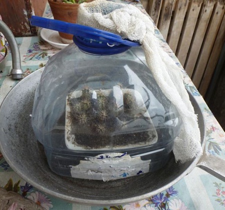 Эта хорошая жизнь вот какая. Плошка с кактусятами уже два месяца стоит на балконе 14-го этажа (сам балкон выходит на юго-восток). Сверху плошка прикрыта верхней половинкой от пятилитровой колбы из-под питьевой воды с небольшим кусочком марли для притенения. Снизу - сковорода, которая хорошо разогревается на солнце и греет плошку. Поливаю вдоволь. Может, это и глупо устроено, но сеянцы вроде не "жалуются". Самые крупные уже достигают 11-12 мм в диаметре.