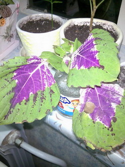 не думаю, балкон на восток, ты видела, горшок висел на стене, куда прямое солнце только до 10ч попадает, потом оно выше поднимается и на гераньку не попадает, на форуме о гераниевых есть фотка с похожим явлением, там хозяйка своей плюшки сводит проблему к сухому воздуху, говорит, что после поселения плюшки на кухню, лист пошел нормальный, иду ее путем , хотя на кухонном окне и темновато для гераней Колеус такой красавец ! Таня, твой отвезла маме в клумбу, сфоткаю позже, так подрос на солнышке!!! Таня, а мой абутилон пропадать без меня надумал... Пытаюсь спасти Твой сочный такой! Красавец!