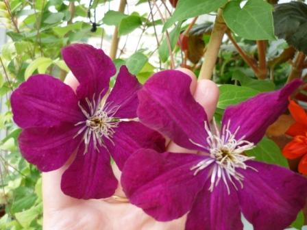 клематис Руж Кардинал, цветы мельче, чем у прошлого цветущего товарища, зато цвет насыщенней