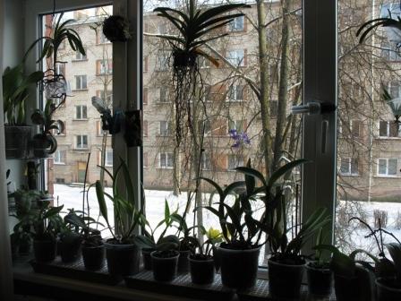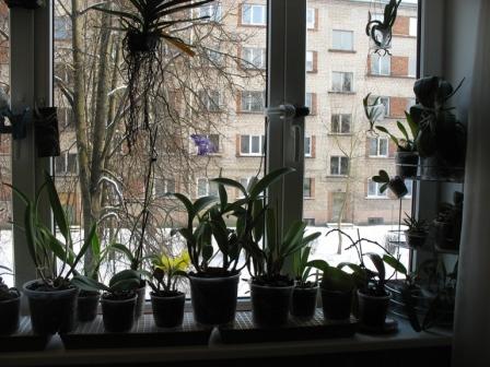 Честно говоря, после Вашей лоджии я несколько сомневалась, показывать ли вообще моё безобразие или лучше затихариться и выставлять только портреты крупным планом . Но уж что есть на данный момент . Окно у нас на 4-м этаже и перед ним огромный двор, совсем свободный от деревьев (при том, что Югла - очень зелёный район и больших деревьев вокруг полно). Забыла сказать, комната угловая и там 2 окна. Во второй половине лета принесли домой люксометр (на пару дней) и измерили освещённость на этом подоконнике, оказалось 5000 Лк, а в мае, думаю, будет немного больше. Моим фаленопсисам и некоторым другим теневыносливым товарищам (в том числе и софронитис) хватает. Но хочется, конечно, большего и надо будет серьёзно думать, что и как можно модернизировать.